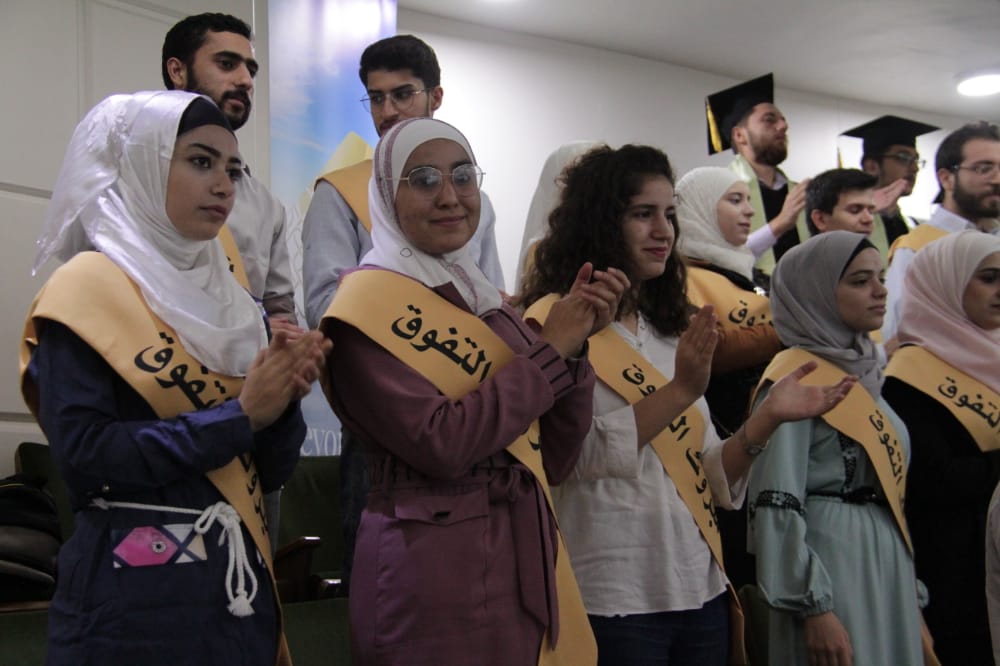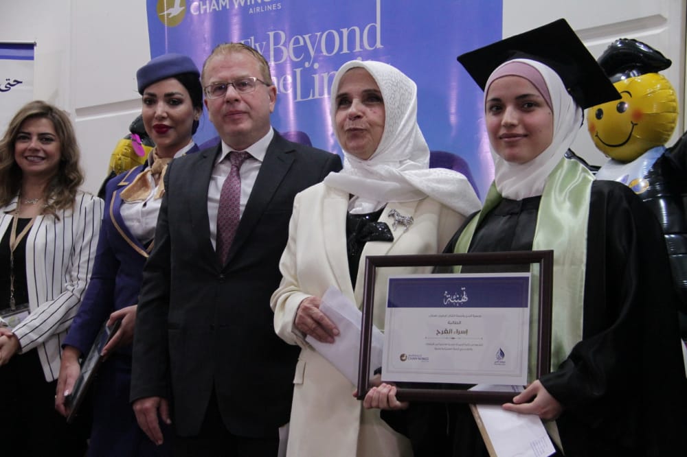 إيماناً منها بأهمية العلم في تطوير وبناء الوطن وانطلاقا من مسؤوليتها الاجتماعية تجاه شباب وشابات سورية كرمت أجنحة الشام للطيران اليوم أكثر من 80 خريجاً ومتفوقاً من طلاب التعليم الجامعي والثانوية العامة الذين ترعاهم جمعية الندى التنموية وذلك خلال حفل أقيم في مجمع خريجي المعاهد التجارية بالمزة .