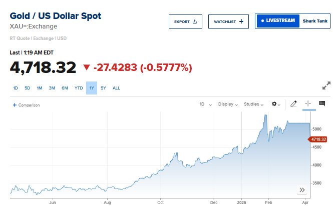 هبط الذهب في المعاملات الفورية بنسبة 0.5% إلى 4718.32 دولار للأونصة.